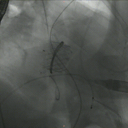 5.在确认Mi-thos瓣膜的位置和对位无误后,缓慢回撤输送系统,使其准确定位于瓣环上。随后,140次/分快速起搏下释放心室部分的瓣膜,并通过其自带的固定倒钩装置牢固锚定于原生二尖瓣位置上。