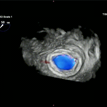 图A-C:术前使用3D打印模拟手术(A) 调整瓣膜释放位置及其与瓣环的同轴对齐。(B, C) 生物瓣膜完全展开,可分别在左心房和左心室视角下观察其状态。