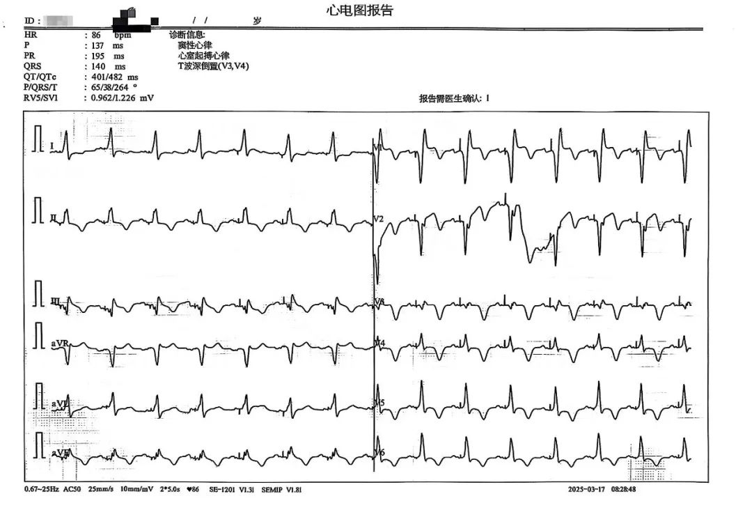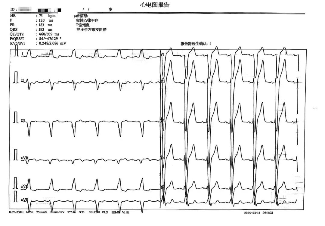舒主任指出:"患者存在完全性左束支传导阻滞,异常宽大的QRS波导致心脏收缩严重不同步,这是心功能恶化的关键机制。若不及时干预,射血分数可能进一步下降。"