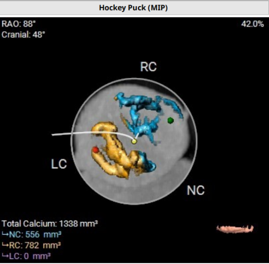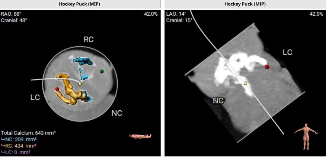 患者主动脉瓣重度狭窄并轻微反流,瓣叶增厚钙化明显,瓣环折算直径为22.0mm,开放面积0.4cm²,同时合并左室流出道梗阻,右冠状动脉多发斑块,管腔中度狭窄,结合STS评分1.59%及EuroSCORE Ⅱ评分1.36%,属于外科手术高危患者。经过手术团队综合评估,拟行经导管主动脉瓣置换术, 选择美敦力 Evolut PRO + 26mm 自膨式瓣膜,在球囊预扩后精准释放,术中实时进行冠脉造影监测右冠灌注,如有异常则立即介入,进行右冠球囊扩张和开窗支架置入,保障冠脉血供,避免术后急性缺血事件。