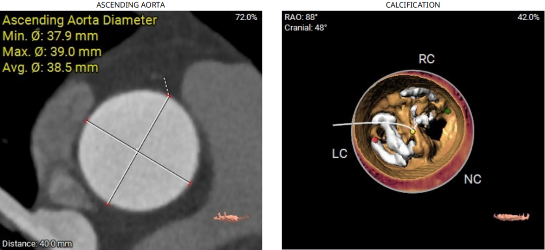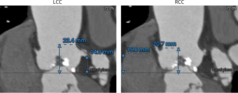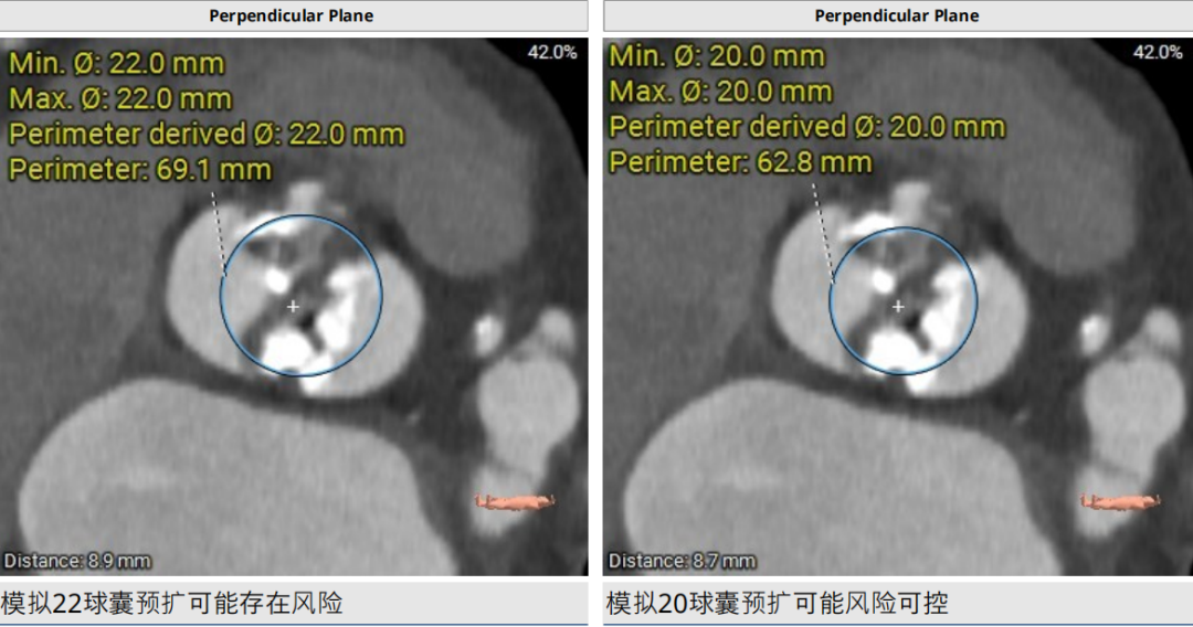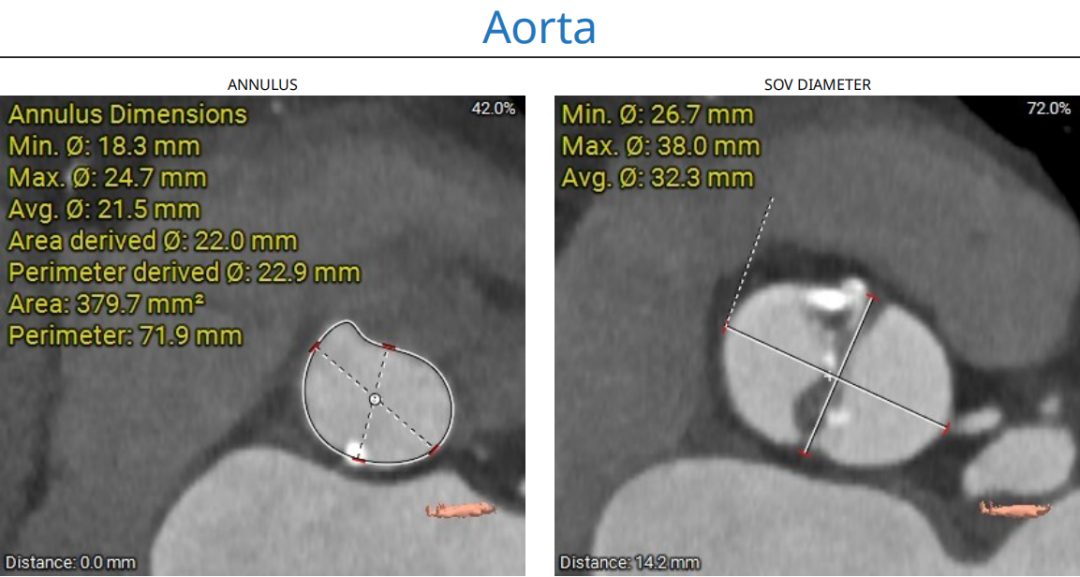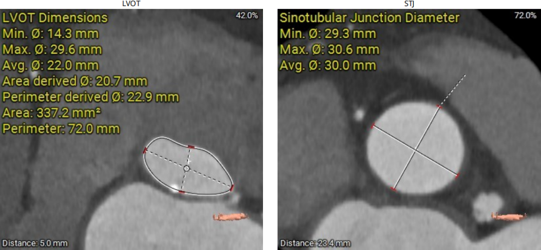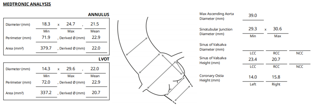 主动脉瓣环折算直径22.0mm,LVOT直径20.7mm,瓣环及流出道平面可见钙化SOV 平均直径32.3mm,STJ直径30.0mm,升主动脉直径38.5mm;