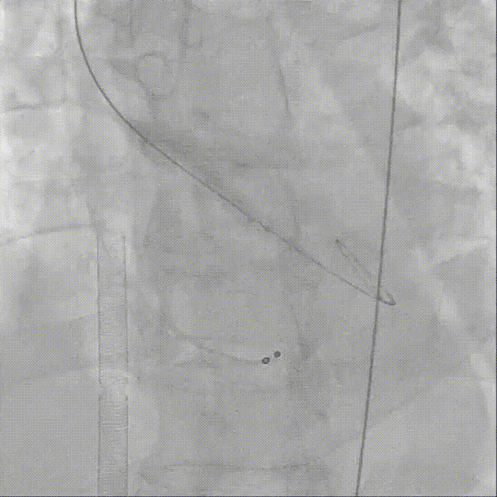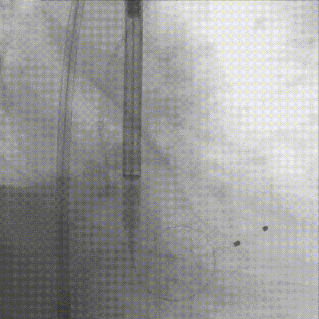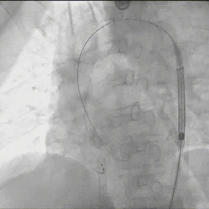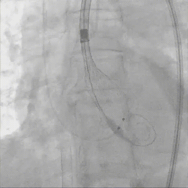 Evolut PRO + 26mm瓣膜装载至输送系统,输送系统顺利过弓并成功跨瓣;