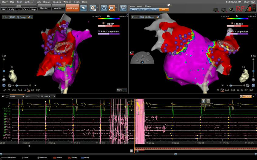 近日,在心内科主任周浩教授的带领下,温州医科大学附属第一医院电生理团队成功完成全国首批VARIPULSE脉冲消融导管指导下的房颤消融手术。该技术通过三维电生理标测系统(CARTO 3)与脉冲电场消融(PFA)的深度整合,实现了房颤治疗的精准定位与安全消融,标志着我国房颤治疗正式迈入“三维可视化脉冲消融”时代。