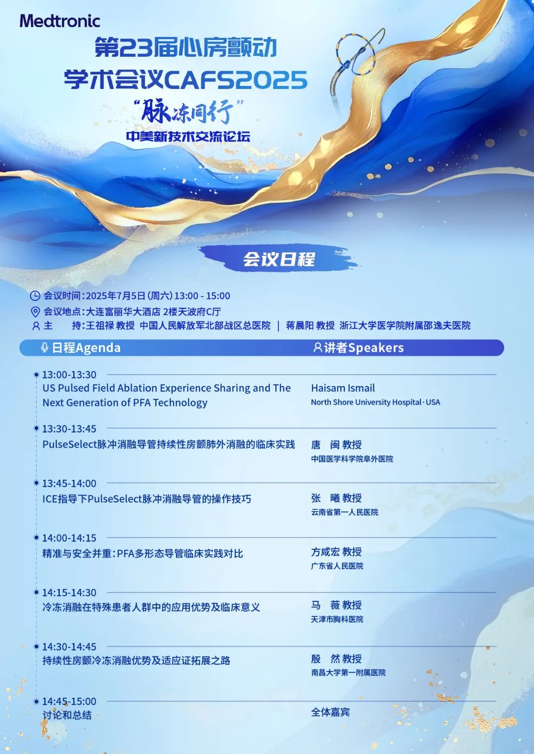 7月5日13:00-15:00,邀您线下相聚大连富丽华大酒店2楼天波府C厅,与行业大咖面对面,共同解锁 PulseSelect™ 临床应用新境界!敬请期待这场中美电生理学术盛宴!
