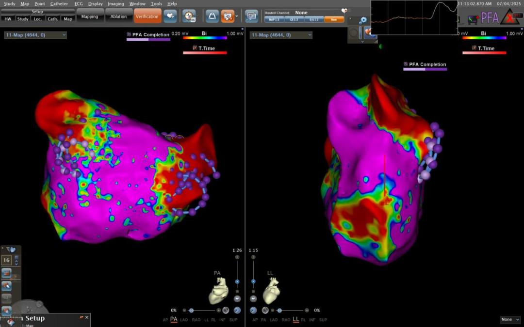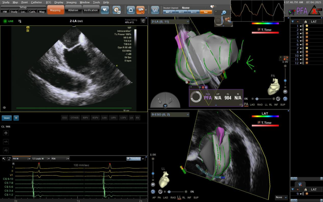 近日,江苏省人民医院重庆医院在杨刚院长、王骋及叶昌伦主任带领下,成功完成零射线(ICE)指导下VARIPULSE脉冲消融房颤手术。该技术通过三维电生理标测系统(CARTO 3)与脉冲电场消融(PFA)的深度整合,实现了房颤治疗的精准定位与安全消融,标志着我国房颤治疗正式迈入“三维可视化脉冲消融”时代。