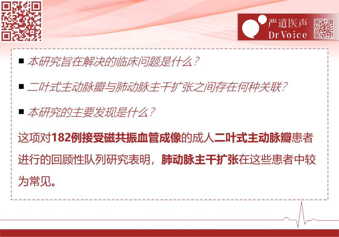 二叶式主动脉瓣(BAV)是最常见的先天性心脏病之一,约影响全球1%的人口。虽然BAV与主动脉病变之间的关联已得到充分证实,但BAV是否还与肺动脉主干(MPA)扩张相关尚不清楚。尽管有证据表明患有BAV的儿童患者存在肺动脉主干扩张,但这种关系在成人中尚未得到研究。BAV与主动脉病变之间的关联提示存在血管壁退化和扩张的遗传易感性,这可能也会使患者易于发生肺动脉主干扩张。