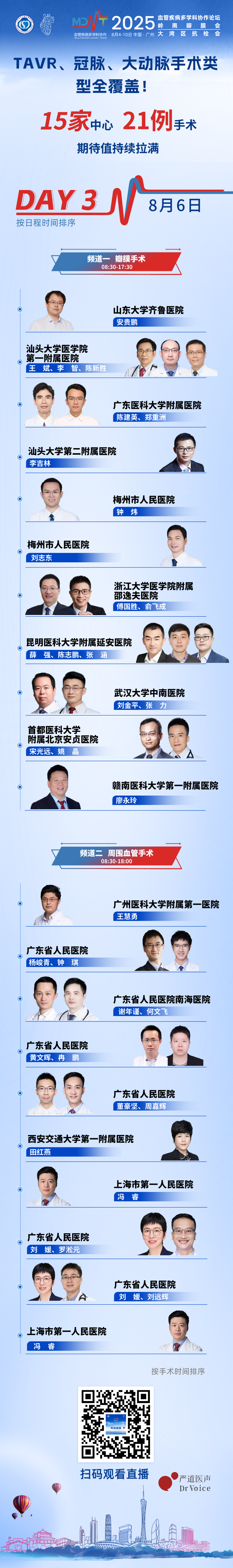 2025年8月4日-10日,由广东省介入性心脏病学会主办,广东省人民医院承办的“2025血管疾病多学科协作论坛/岭南瓣膜会/大湾区抗栓会(VMDT 2025)”于广州以线上线下相结合的形式如期而至。8月5日,大会手术直播进入第二日——TAVR DAY 2,联动湾区,多方合力,共谱 TAVR 技术创新与临床实践的交流新篇!