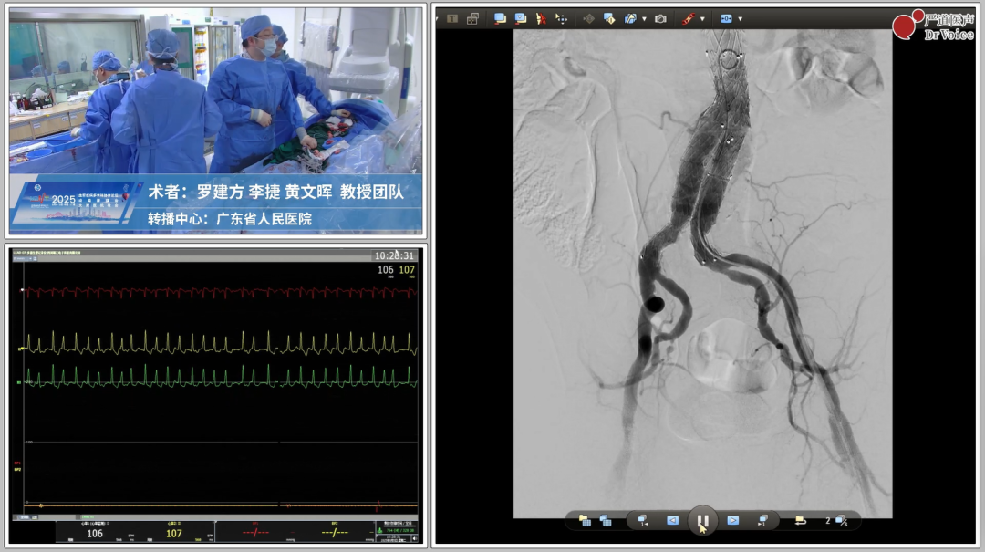 同时,广东省人民医院罗建方教授、李捷教授、黄文晖教授带来了一例TAVR+EVAR一站式手术。在TAVR+EVAR一站式手术中,患者出现阵发性心房颤动,高脂血症,颈动脉狭窄等合并症,手术难度与风险攀升。面对三重挑战,团队通过右股动脉主入路,精准完成瓣膜植入与动脉瘤隔绝的无缝衔接,最终以精准操作精度攻克复合病变难题,此外,罗建方教授、李捷教授还带来了一例应用可调弯系统完成的TAVR手术录播,为湾区心血管健康事业协同发展注入强劲动力。