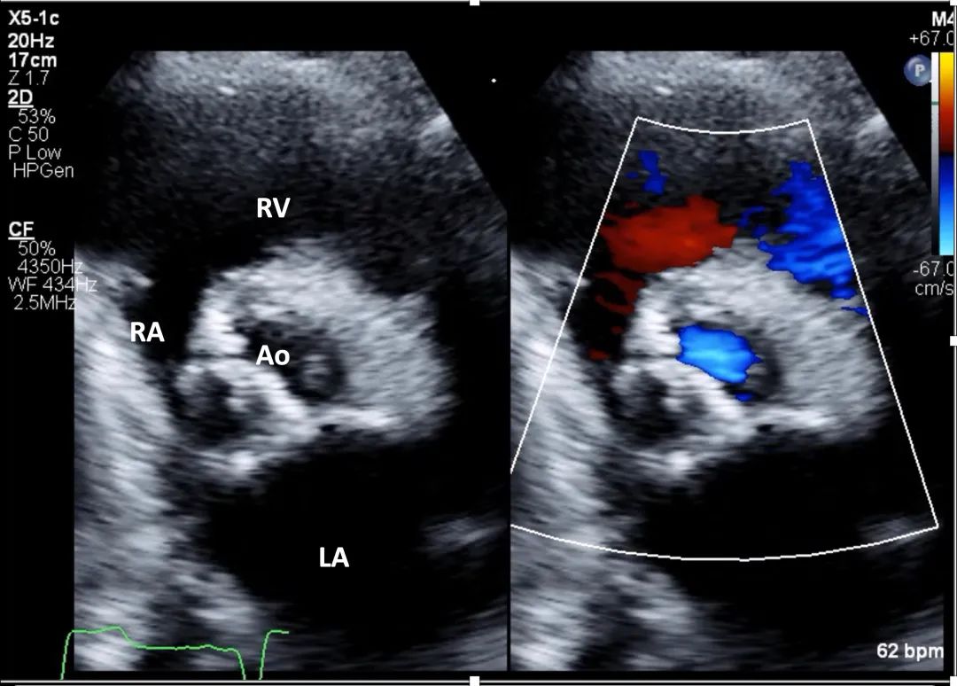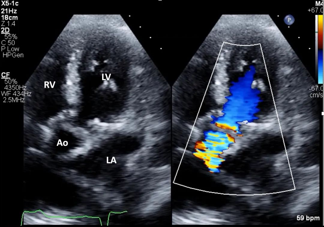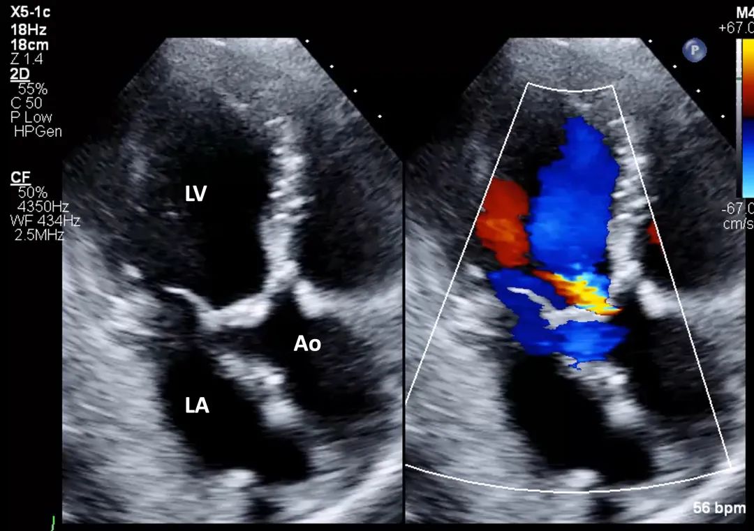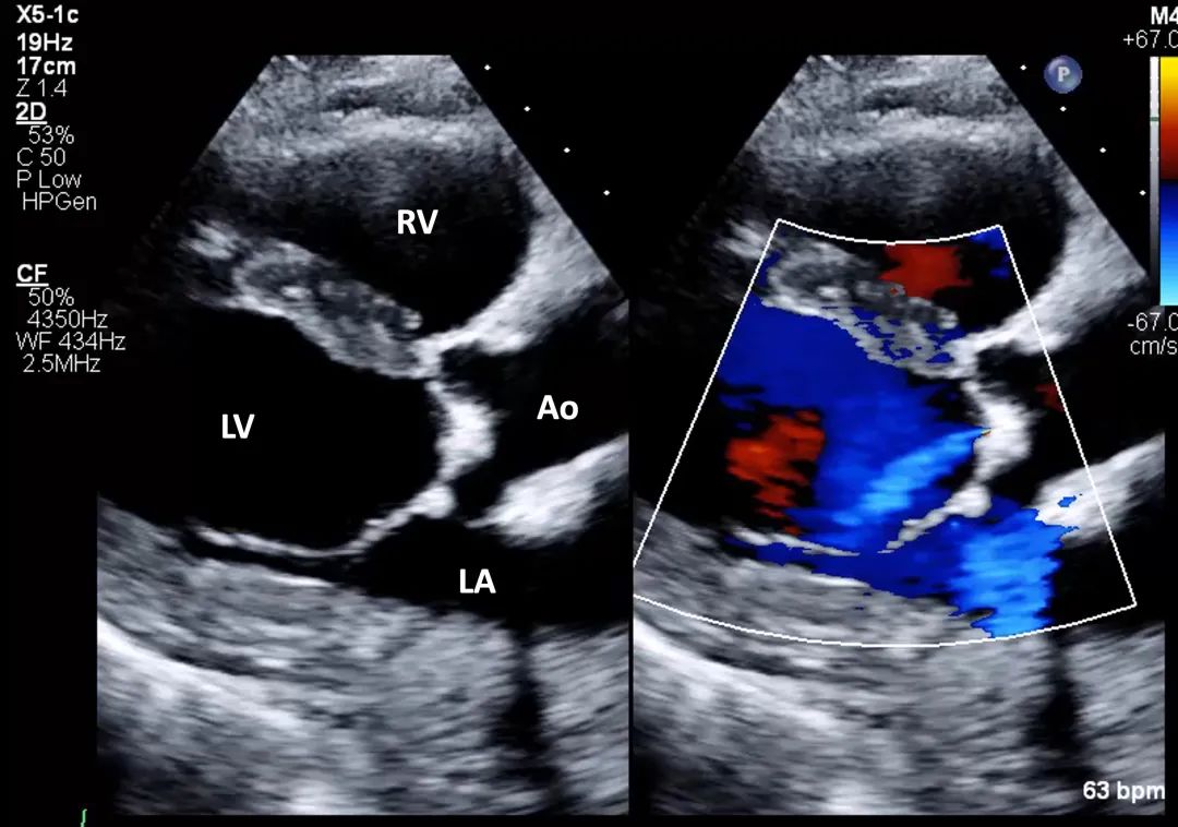 图3. 胸骨旁长轴切面放大图像(普通二维和彩色多普勒对比)