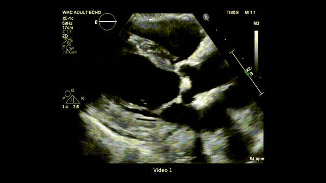 1、使用经胸超声心动图探头,从胸骨旁长轴切面开始操作流程,以评估左室射血分数、左室壁厚度,以及主动脉瓣和二尖瓣(图2,视频1)。