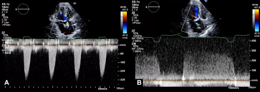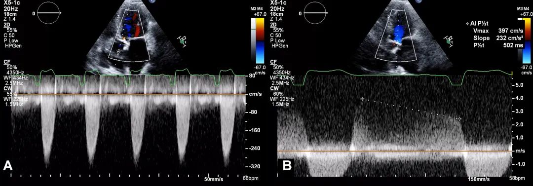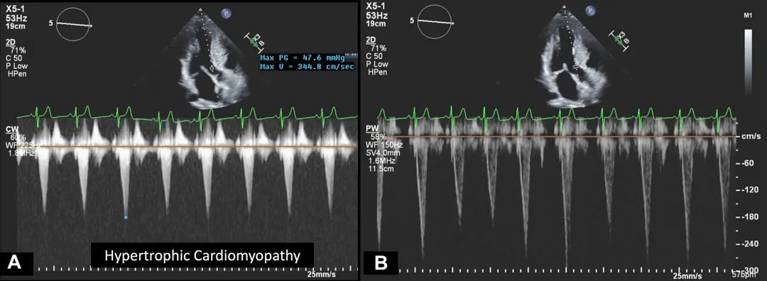 肥厚型心肌病患者的连续多普勒波形呈晚期尖峰的匕首状波形(A);脉冲多普勒波形则表现为流速增高并伴有混叠B)。