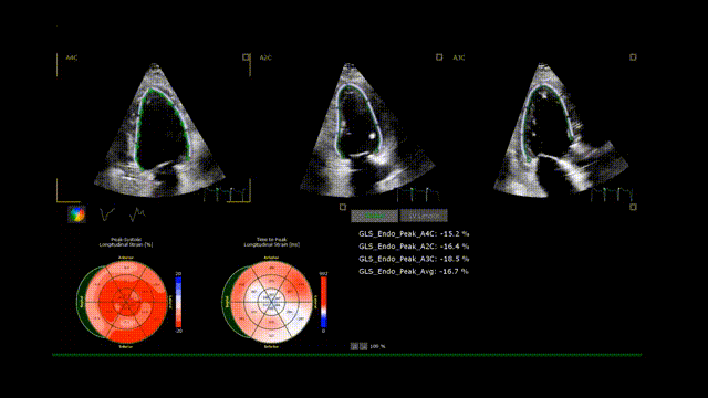 6、心尖四腔心切面: 评估左室射血分数(二维和/或三维)及左室整体纵向应变(global longitudinal strain,GLS)。需注意的是,评估左室整体纵向应变必须同时获得心尖四腔心、二腔心和三腔心视图(图7,视频4)。