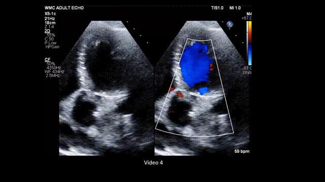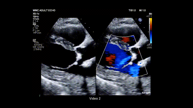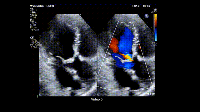 视频5. 心尖五腔心切面应用彩色多普勒(彩色与二维灰阶对比模式),评估主动脉瓣是否存在流出道梗阻所致的狭窄性彩色镶嵌血流模式,以及主动脉瓣反流情况。