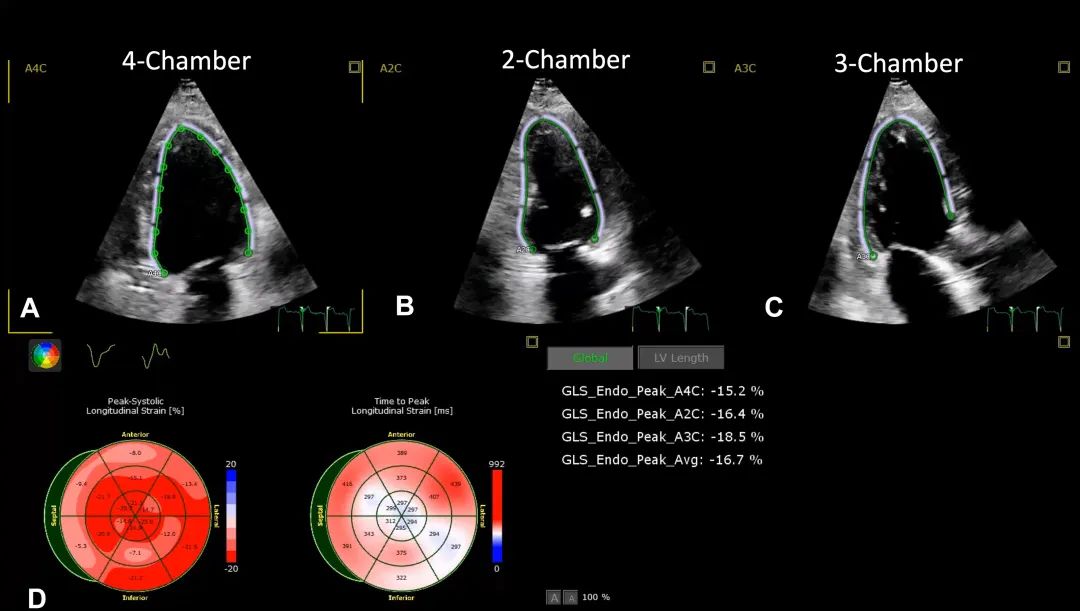 利用四腔心切面(A)、二腔心切面(B)和三腔心切面(C)进行左室应变评估。这些图像经分析后,以靶心图形式(D)显示节段性纵向应变。
