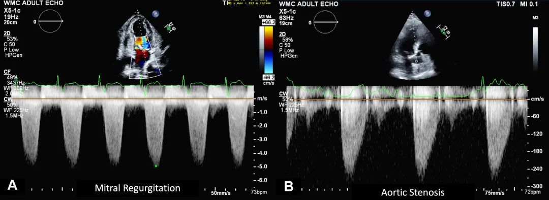(A) 二尖瓣反流的多普勒波形呈圆滑轮廓,出现在心动周期的等容收缩期和等容舒张期。(B) 主动脉瓣狭窄的多普勒波形呈圆滑但稍尖锐的速度波形,出现在收缩期内,即等容收缩期之后但在等容舒张期之前。