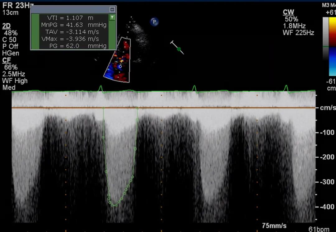 主动脉瓣狭窄患者的连续多普勒评估。已降低增益设置以确保不会导致跨瓣压差被高估。