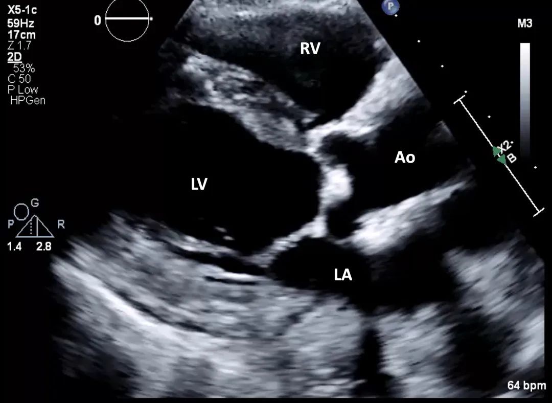 使用经胸超声心动图探头,从胸骨旁长轴切面开始,评估左室射血分数和室壁厚度。Ao = 主动脉(aorta);LA = 左房(left atrium);LV = 左室(left ventricular);RV = 右室(right ventricular)。
