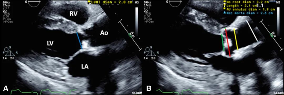 胸骨旁长轴切面测量左室流出道直径(收缩中期测量;左图,蓝线)、主动脉瓣环直径(右图,绿线)、主动脉窦直径(右图,红线)、窦管交界直径(右图,黄线)和升主动脉直径(右图,白线)。缩写同图2。