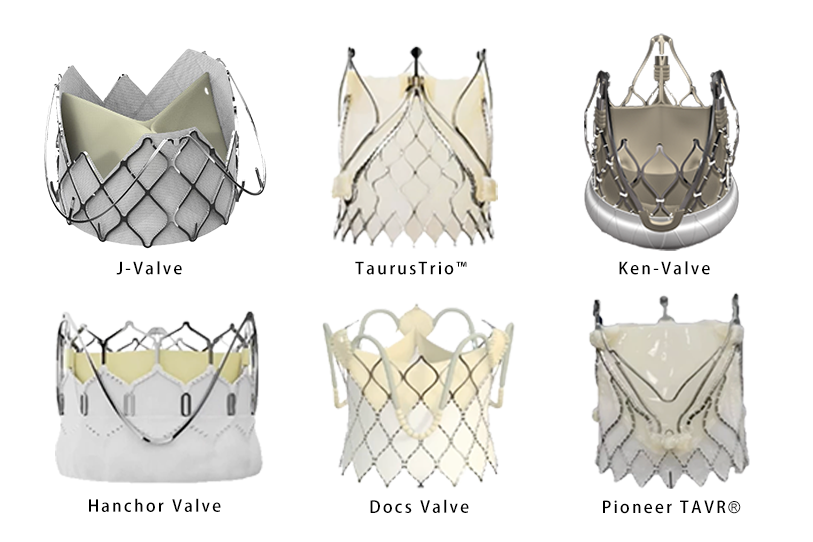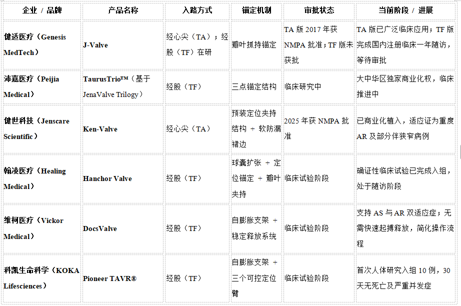 J-Valve 系统由中国团队设计,2014 年完成全球首例纯 AR 经心尖 TAVR,2017 年在中国获批。“瓣叶抓取”结构通过挂钩固定原生瓣叶,实现无钙化锚定。经股版本(J-Valve TF)已完成中国一年随访;J-valve经股版本获 FDA 突破性器械认定,并进入确证性试验(JOURNEY)。早期结果显示,植入成功率超过 95%,一年生存率超过 94%。