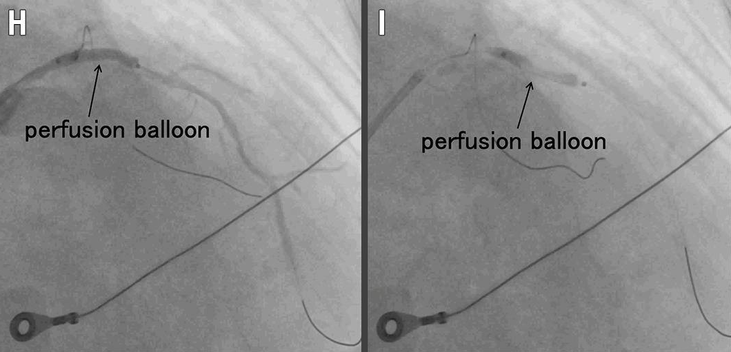使用 3.0/20mm 灌注球囊(Ryusei [Kaneka Medix])在疑似夹层入口处进行短时间扩张。在LAD灌注得以恢复的情况下,能够对LAD进行造影(图 1H)。