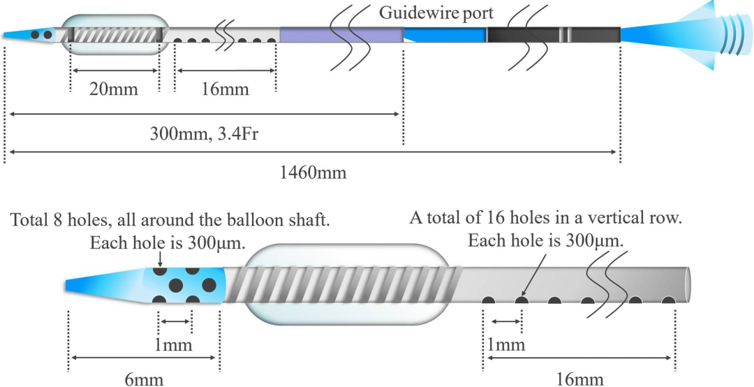 ▹球囊近端:16 个纵向排列、间距 1 mm 的灌注孔