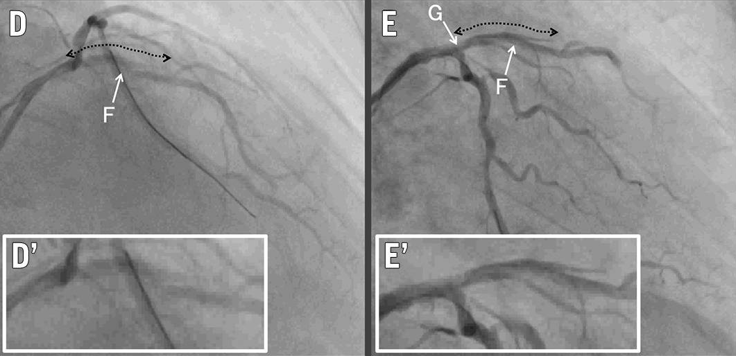 D-E. 夹层发生:LAD夹层(虚线箭头),TIMI 2级血流,(D'、E')放大图像