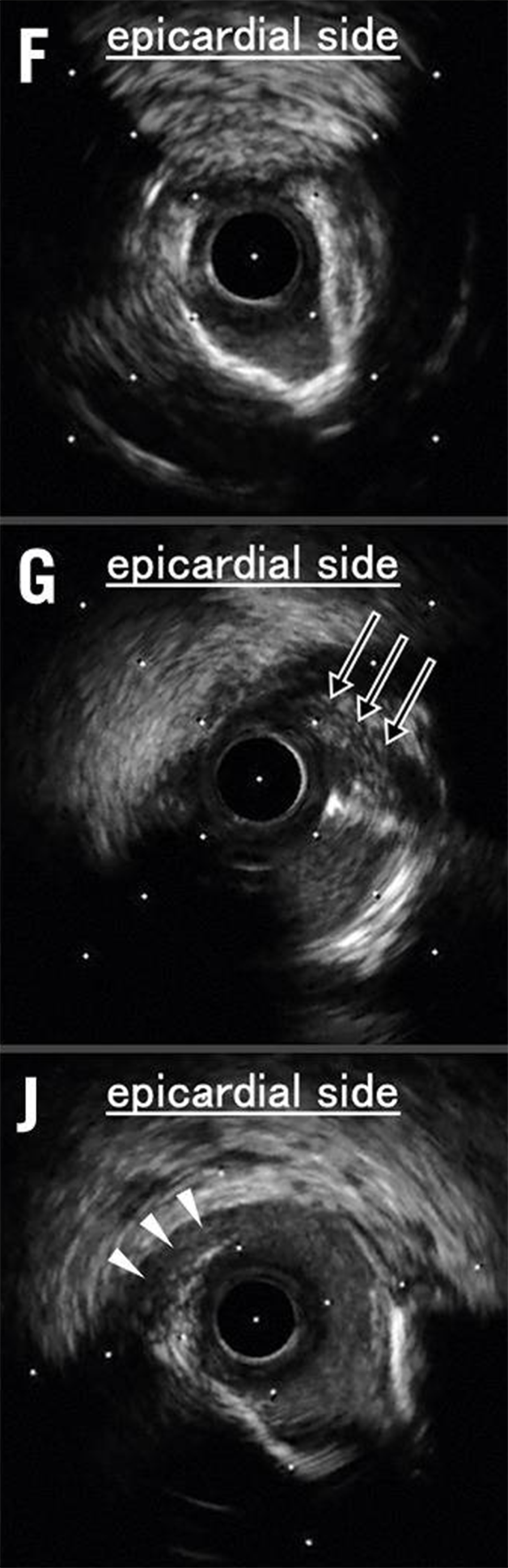 F-G. IVUS:真腔受压,假腔延伸至钙化后方,内膜撕裂(黑色箭头)