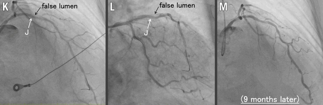 K-L. 灌注球囊术后:最终冠状动脉造影,残余假腔存在