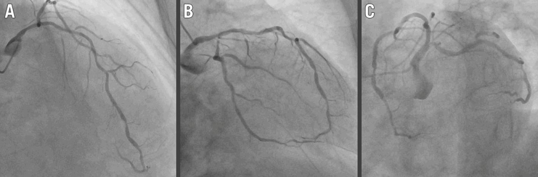 A-C. 初始冠脉造影:LCX开口重度狭窄,左主干-LAD轻度狭窄