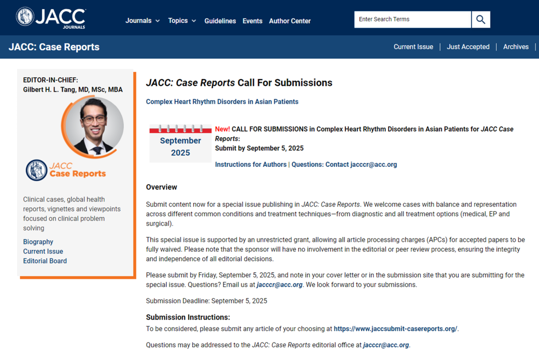 New! CALL FOR SUBMISSIONS in Complex Heart Rhythm Disorders in Asian Patients for JACC Case Reports.