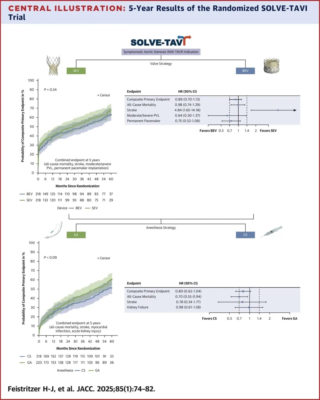 试验设定上述两个主要终点均以非劣效假设进行检验,旨在证明新瓣膜和极简路径在30天临床结局上不劣于对照。随机分组后患者按照各自方案接受治疗:极简路径组在局麻+镇静下于导管室完成经皮瓣膜植入,全麻组则在全身麻醉插管下于杂交手术室或标准手术室完成。需要强调的是,极简组患者如在术中出现疼痛难以控制、运动不安或并发症需要,可及时中转为全麻予以处理,研究亦会记录中转率和原因(此前SOLVE-TAVI中该比例约为3%)。术后管理方面,极简路径通常意味着更快的拔管和早期活动,许多患者可避免常规ICU监护,术后第1-2天即转出院 。相比之下,全麻患者通常按标准路径恢复,拔管后需密切观察,在ICU度过至少一个夜晚。研究计划在30天、1年及长期随访患者,评估各组在心血管死亡、功能改善、瓣膜耐久性等方面的差异。值得注意的是,本研究预计将进行长达10年的随访(研究完成时间预估2033年),以观察瓣膜装置的远期性能和患者生存获益。