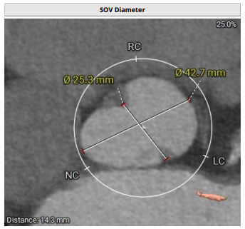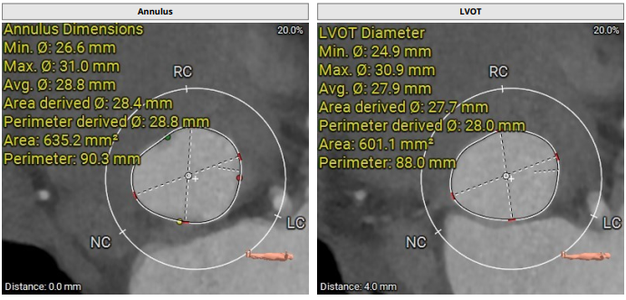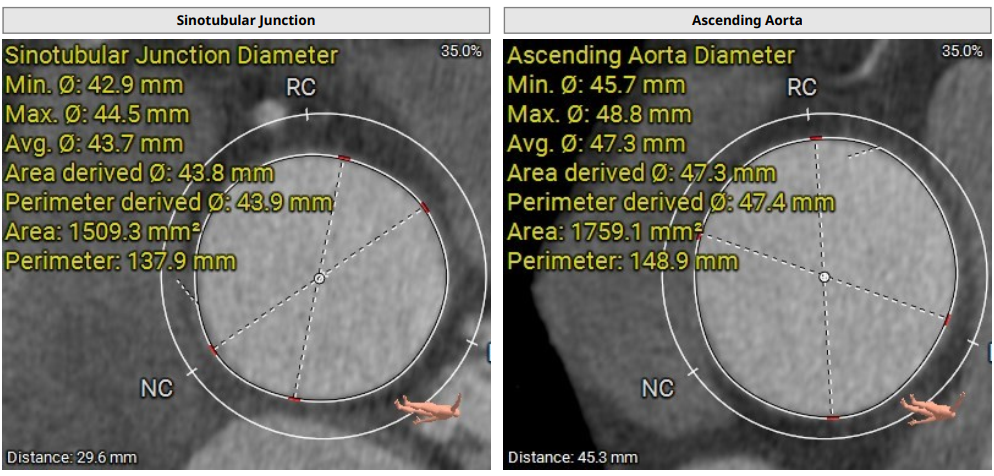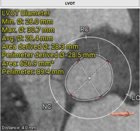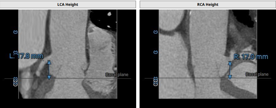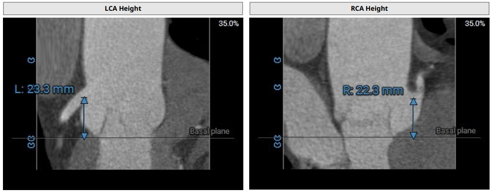 术前影像评估提示,患者为三叶瓣结构,瓣窦分布略显不均,但整体形态规则,无明显钙化负荷。主动脉瓣环直径29.0mm,左心室流出道直径28.5mm,STJ直径34.9mm,升主动脉直径37.9mm,冠脉开口高度充足(左冠17.8mm,右冠17.0 mm)梗阻风险低。