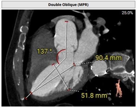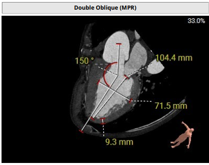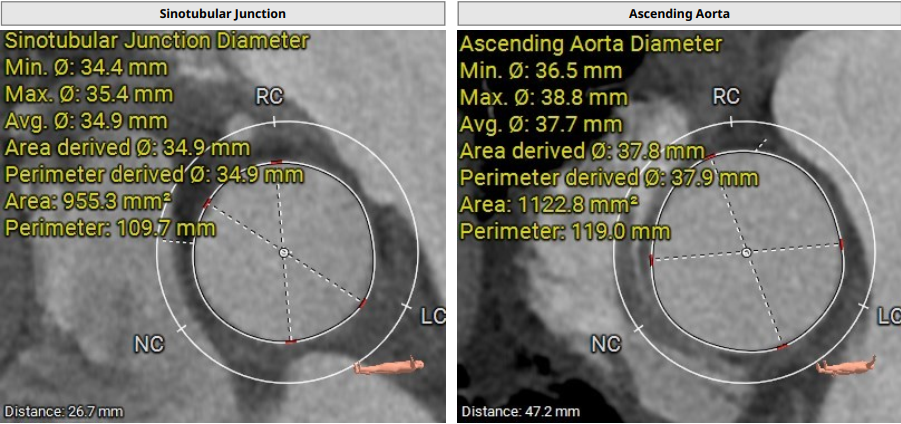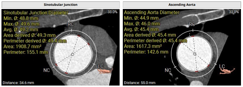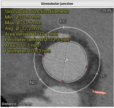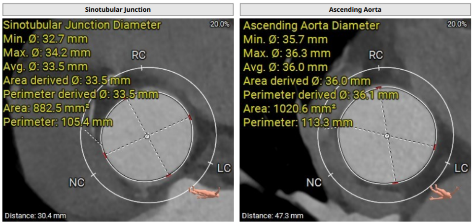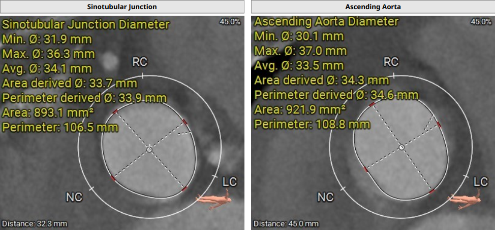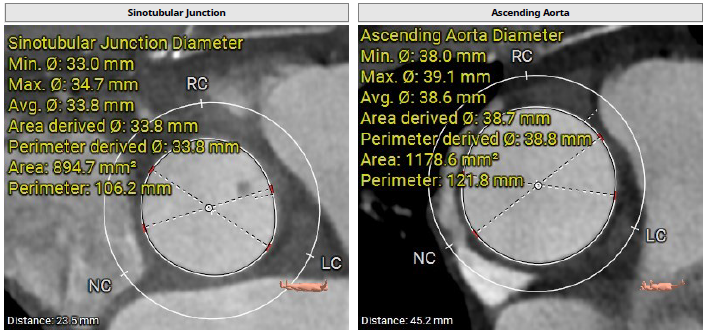 术前影像评估提示,患者主动脉为TYPE0型二叶瓣,瓣叶增厚,边界显示不清,疑似瓣叶脱垂,少量钙化。主动脉瓣环直径31.5mm,左心室流出道直径35.3mm,STJ直径32.3mm,升主动脉直径37.3mm,冠脉开口高度充足(左冠15.6mm,右冠19.1 mm),左室与主动脉夹角158°。