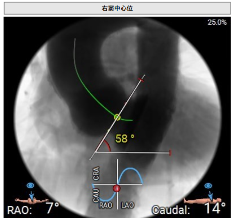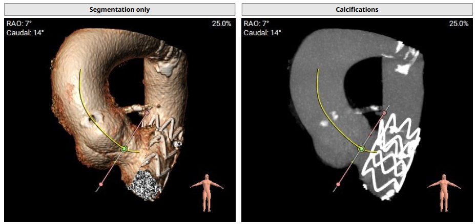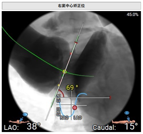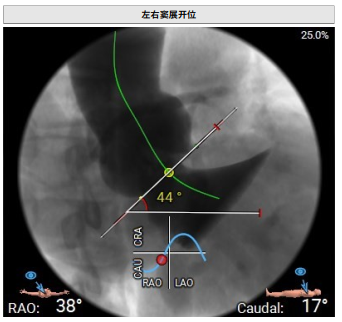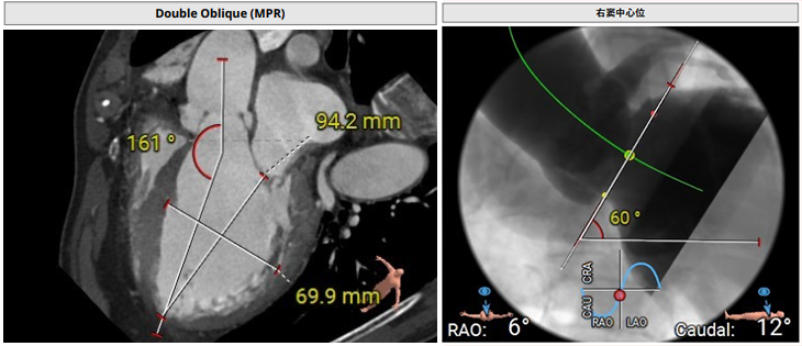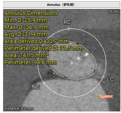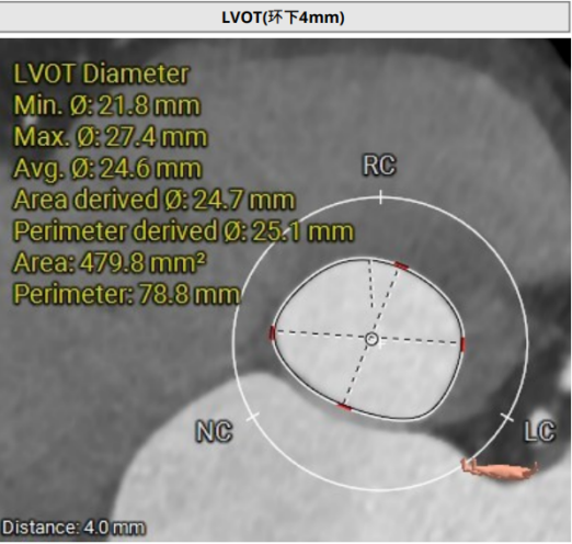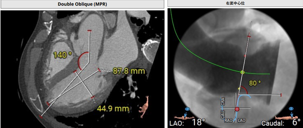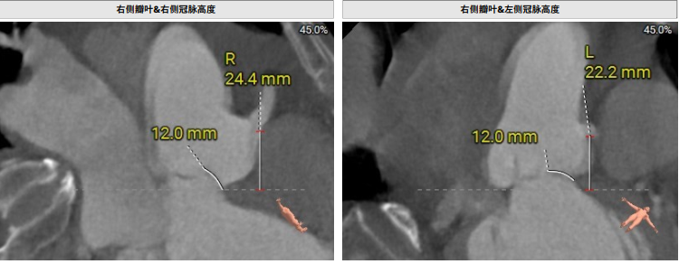 术前影像评估提示,患者主动脉瓣为三叶瓣,分布较均匀,无明显钙化。主动脉瓣环直径约25.5mm,左室流出道直径27.7mm,STJ直径49.9mm,升主动脉直径45.4 mm,冠脉开口高度充足(左冠12.4mm,右冠11.6mm),梗阻风险低。入路角度方面,左室-主动脉夹角为150°,心脏角度60°。