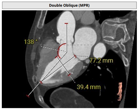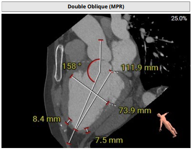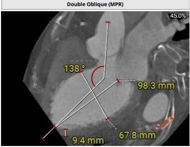 术前影像评估提示,患者主动脉瓣为三叶瓣结构,瓣叶增厚,三个瓣窦分布较为均匀,无明显钙化。主动脉瓣环直径约28.8mm,左室流出道直径30.5mm,STJ直径33.9mm,升主动脉直径34.6mm。冠脉开口高度充足(左冠22.2mm,右冠24.4 mm),冠脉走行良好,无钙化,梗阻风险低。入路角度方面,左室-主动脉夹角为138°。