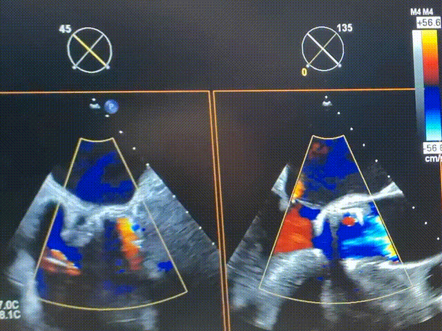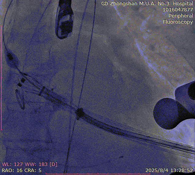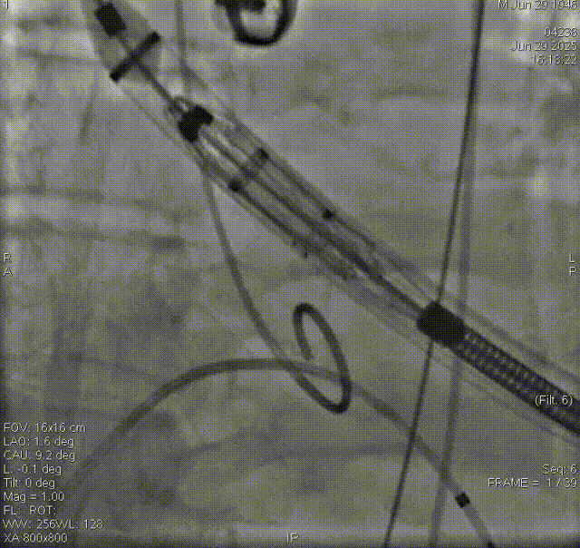 在DSA与超声引导下,手术团队高效精准地完成了瓣膜的定位、释放与功能评估。手术过程顺利,夹持件入窦与定位一气呵成,三枚夹持件的释放与锚定位置与术前评估完全一致,器械用时仅6min左右。患者主动脉瓣重度反流纠正,术后无反流、无瓣周漏。术后心脏彩超显示人工生物瓣启闭良好,平均跨瓣压差3mmHg,流速正常,舒张压从30mmHg提升至70mmHg。