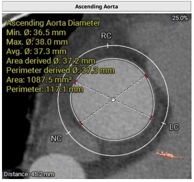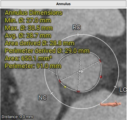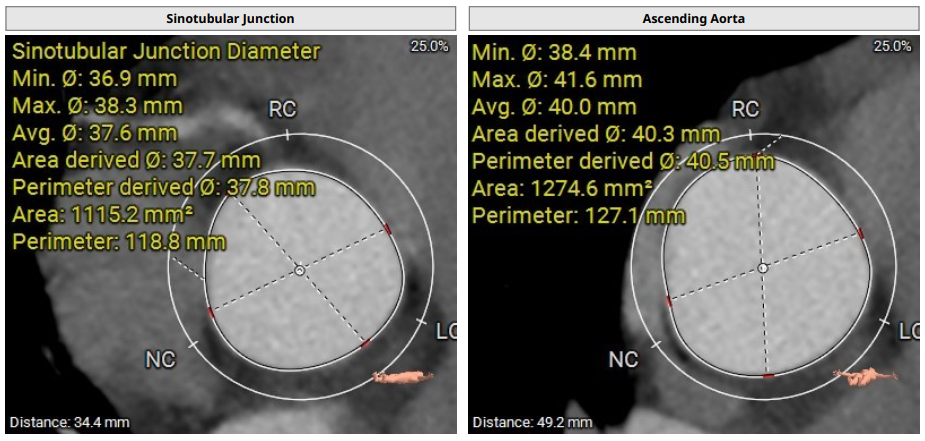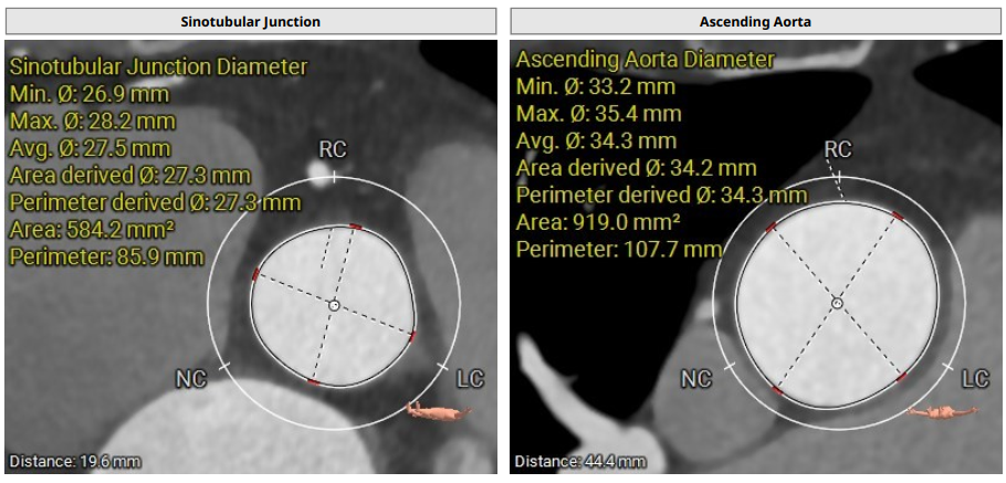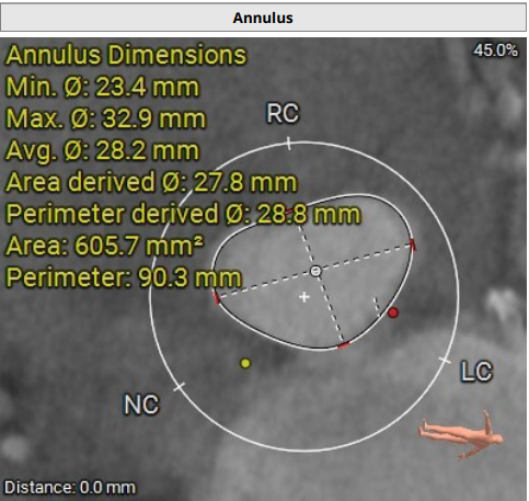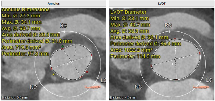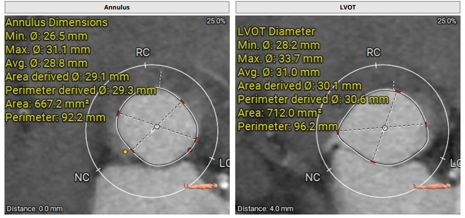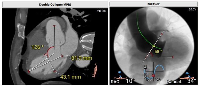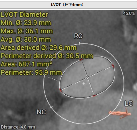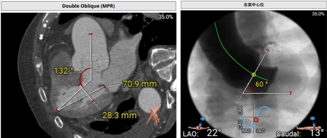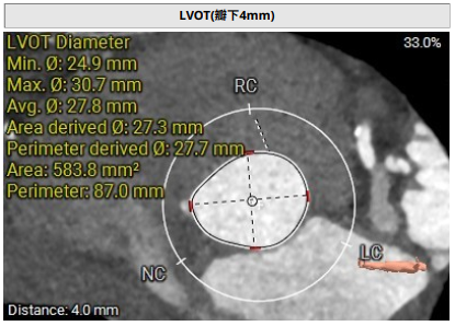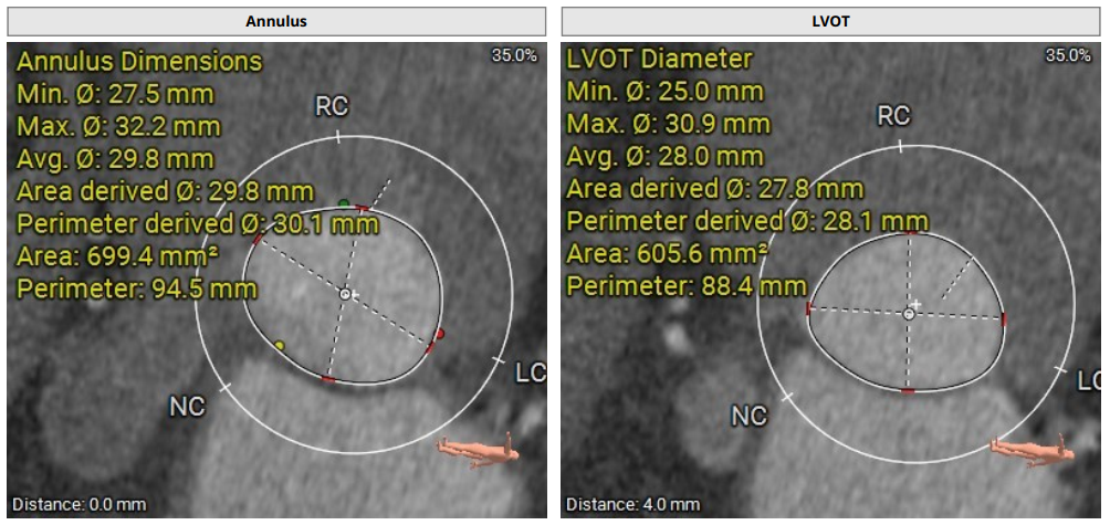 术前影像评估提示,患者为典型三叶瓣结构,瓣窦分布均匀,无明显钙化,主动脉瓣环直径29.3mm,左室流出道直径30.6mm,STJ直径37.8mm,升主动脉直径40.5mm,双侧冠脉开口高度充足(左冠17.0mm,右冠27.6mm),无冠脉阻塞风险,左室-主动脉夹角137°,存在一定同轴性挑战。