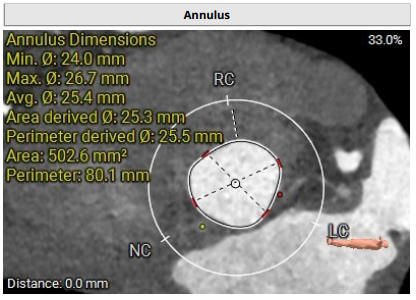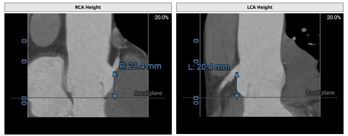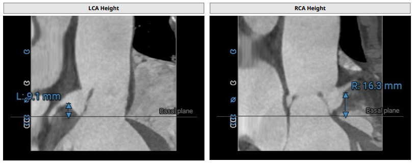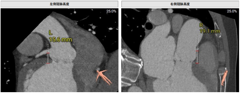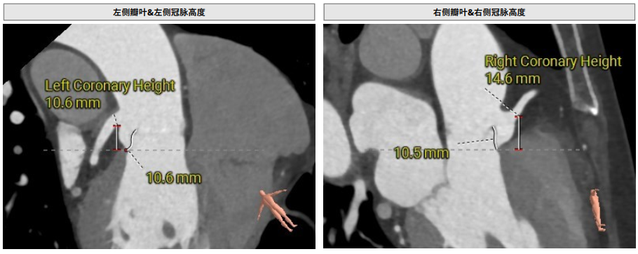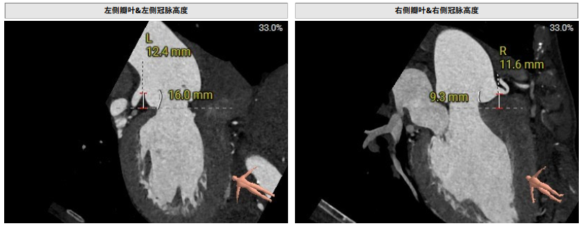 术前影像评估提示,患者主动脉瓣为三叶瓣结构,瓣叶基本等大,左右瓣稍有粘连,瓣叶中度增厚,游离缘轻微钙化。主动脉瓣环直径31.0mm,左心室流出道直径36.4mm,STJ直径33.8mm,升主动脉直径38.8mm,左冠脉开口高度偏低(9.1 mm),左冠瓣瓣叶长约19.4mm,存在术中冠脉阻塞潜在风险,右冠脉开口高度充足,瓣叶长约18.0mm,左室与主动脉夹角161°,心脏角度60°。