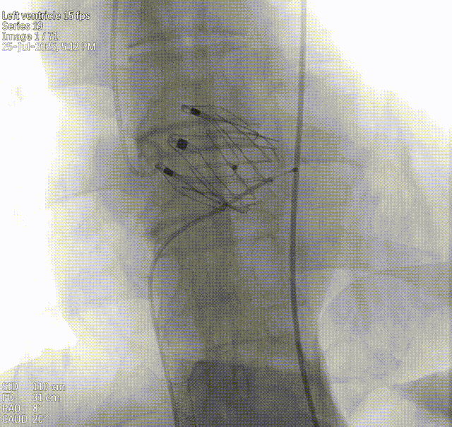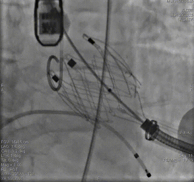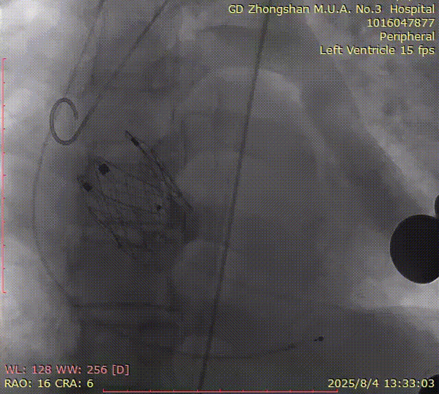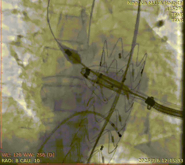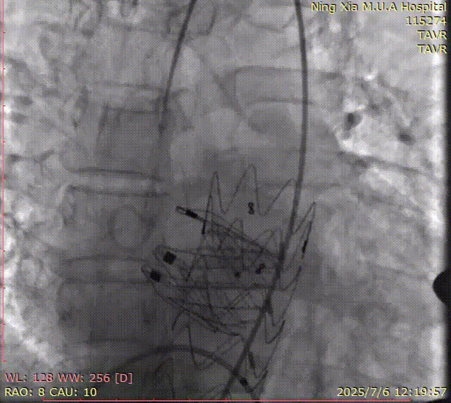 手术过程顺利。术中通过右窦居中造影、定位件入窦造影及释放后功能确认等关键步骤,确保瓣膜锚定准确。器械用时约10分钟。术后即刻主动脉瓣反流程度由术前大量转为消失,术后主动脉瓣跨瓣压差5mmHg,血流动力学良好。