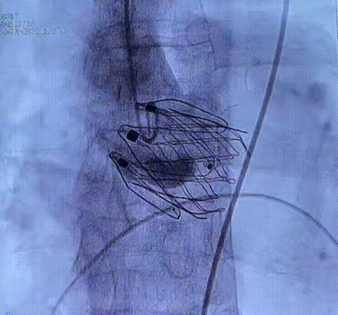 手术过程顺利。术中夹持件入窦、定位一气呵成,瓣膜释放过程顺利、稳定,器械操作时间约10分钟。术后评估结果良好,瓣膜定位稳定,无瓣周漏,平均跨瓣压差为6 mmHg,血流动力学表现良好。
