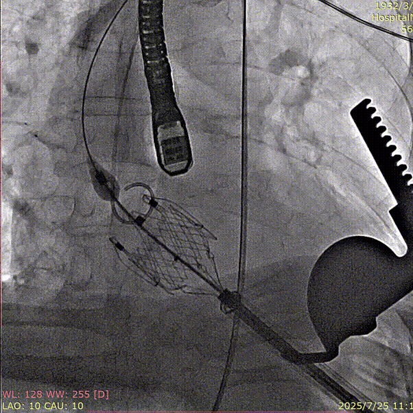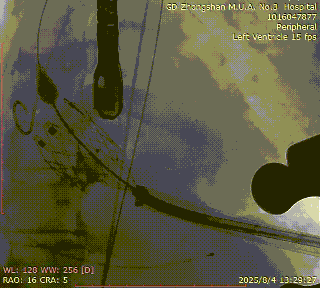 手术过程顺利,器械操作用时仅10分钟。术中通过造影确认右冠窦居中,定位件准确入窦,瓣膜释放顺利。经超声评估,无瓣周漏,手术过程衔接流畅,未出现其他特殊情况。