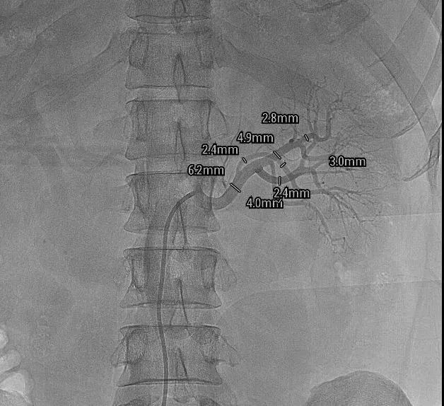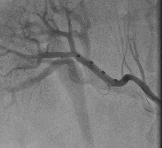 病友术前的肾动脉CTA提示右肾上有个错构瘤,术中肾动脉造影提示患者右肾动脉有4条一级分支,并且存在高位副肾动脉,这给手术增加了极大的难度。