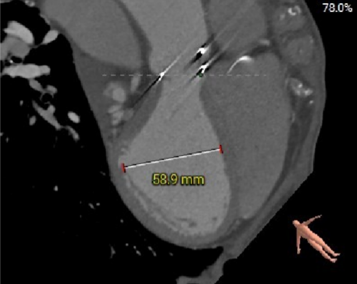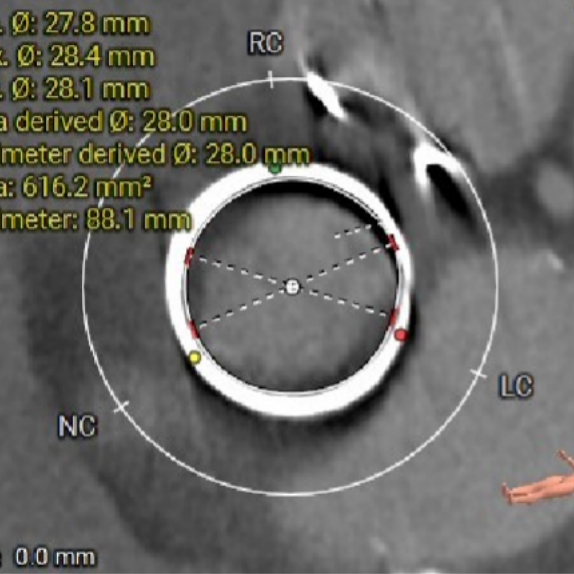 选瓣依据:该二尖瓣原置换生物瓣为Hancoke II#31 ,CT测量生物瓣瓣环周长折算直径约28.0mm,瓣架高度约19.1mm;