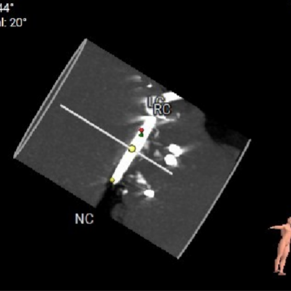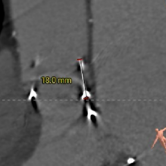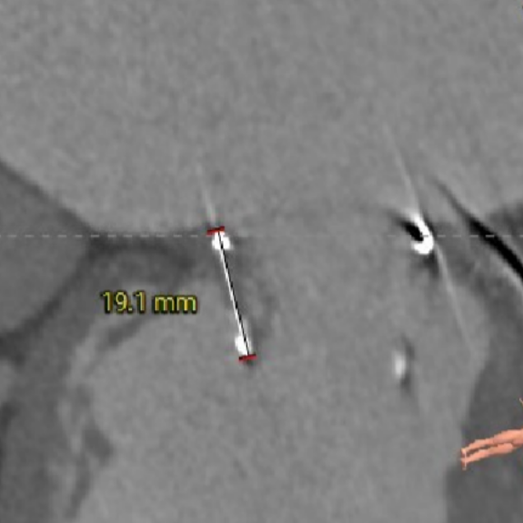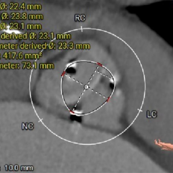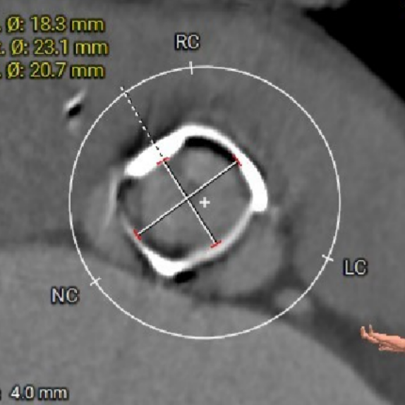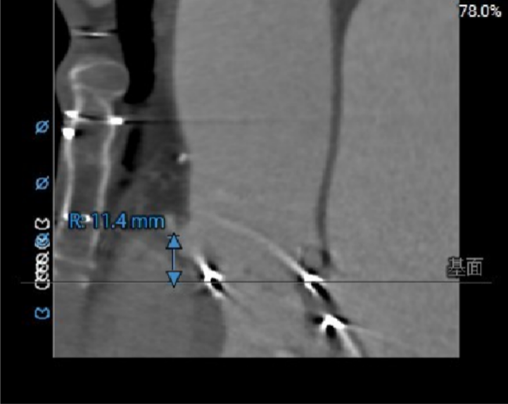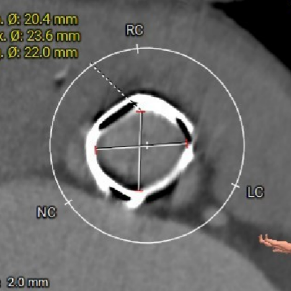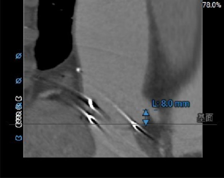 选瓣依据:该主动瓣原置换生物瓣为Hancoke II#25,CT测量生物瓣瓣环周长折算直径约22.8mm,瓣架高度约18.0mm;