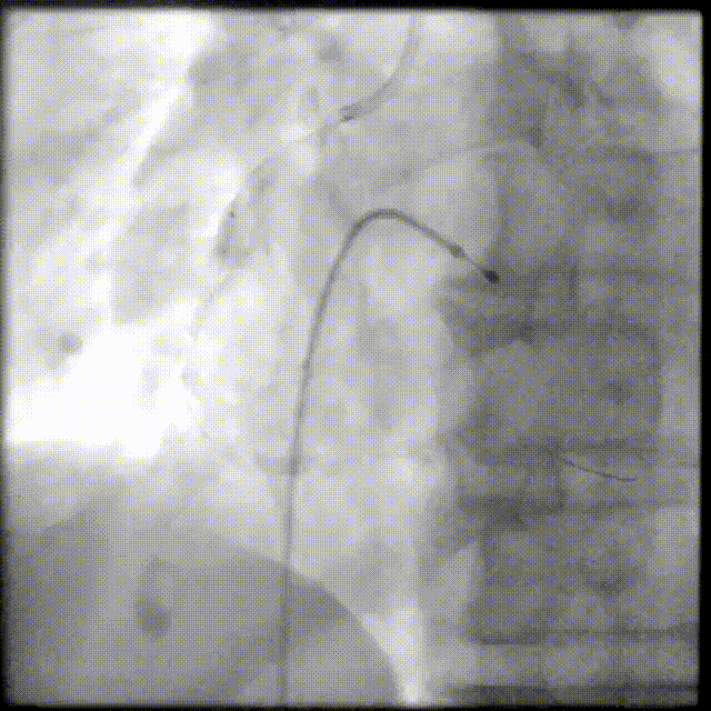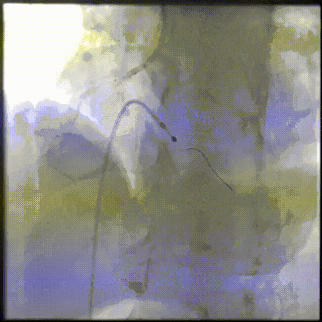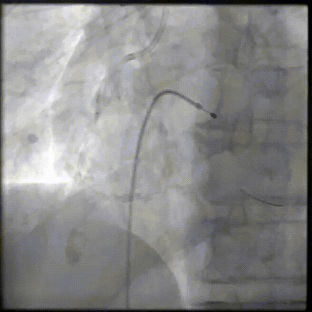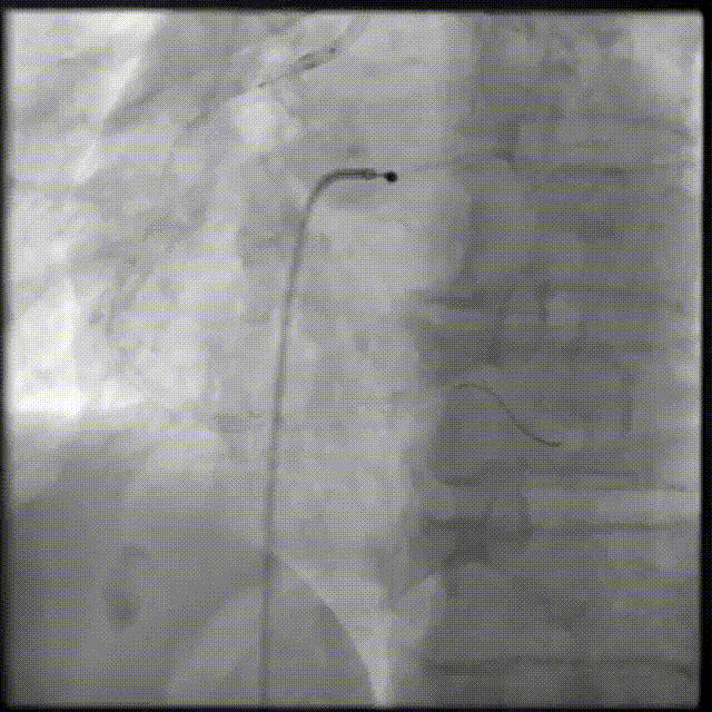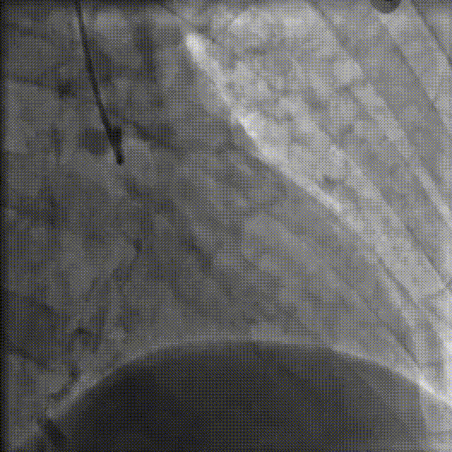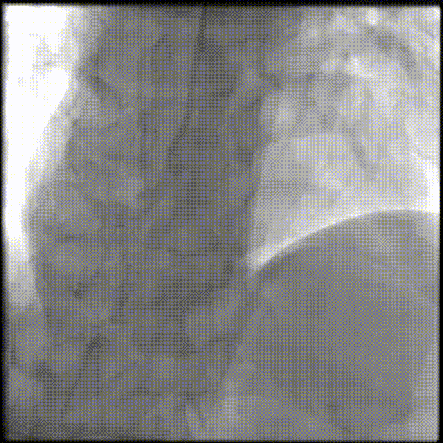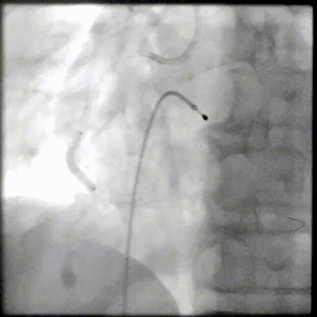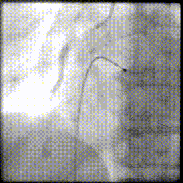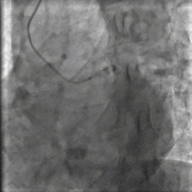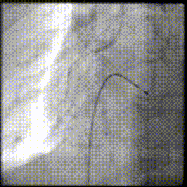 预置临时起搏器后,7F AL1.0无法到位,更换为7F SAL1.0至RCA开口,应用非顺应性球囊2.5X15mm,于RCA中段病变处以12-18atm扩张,球囊膨胀不佳。