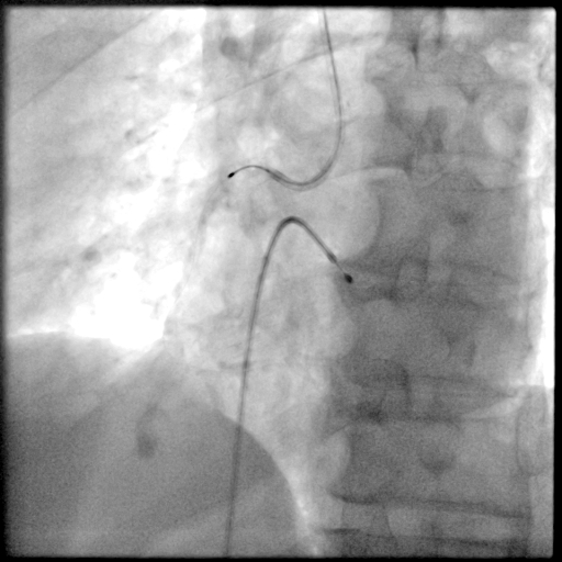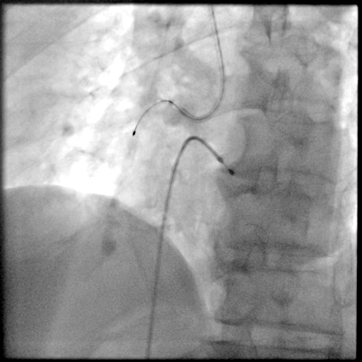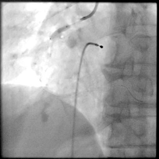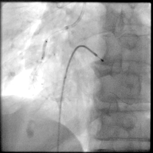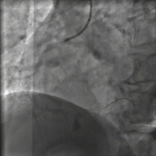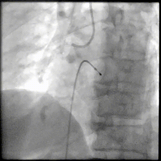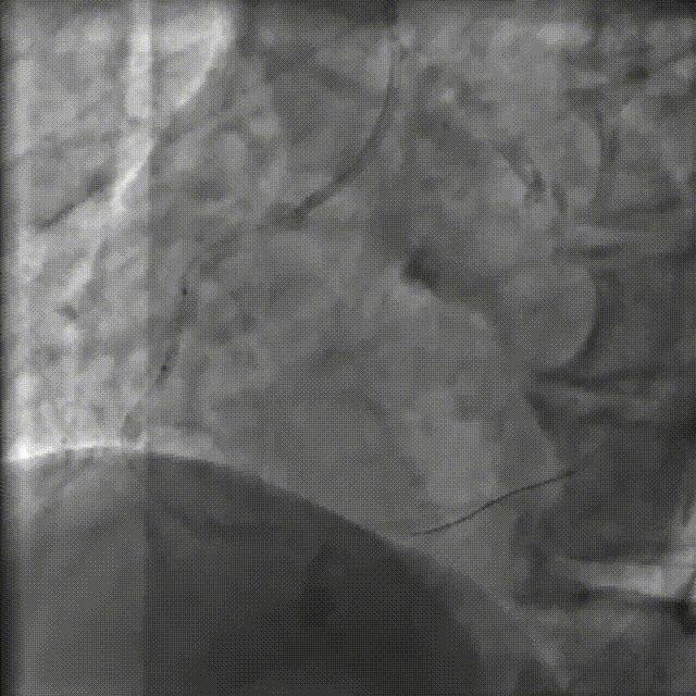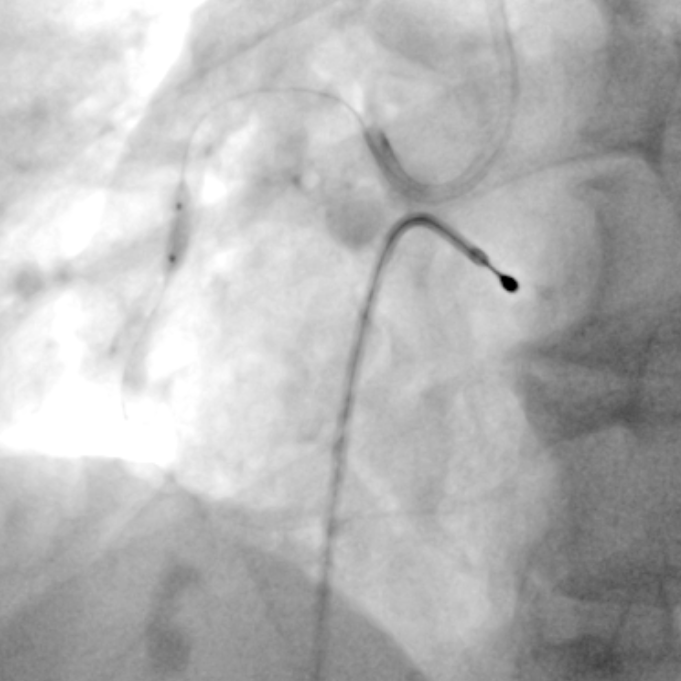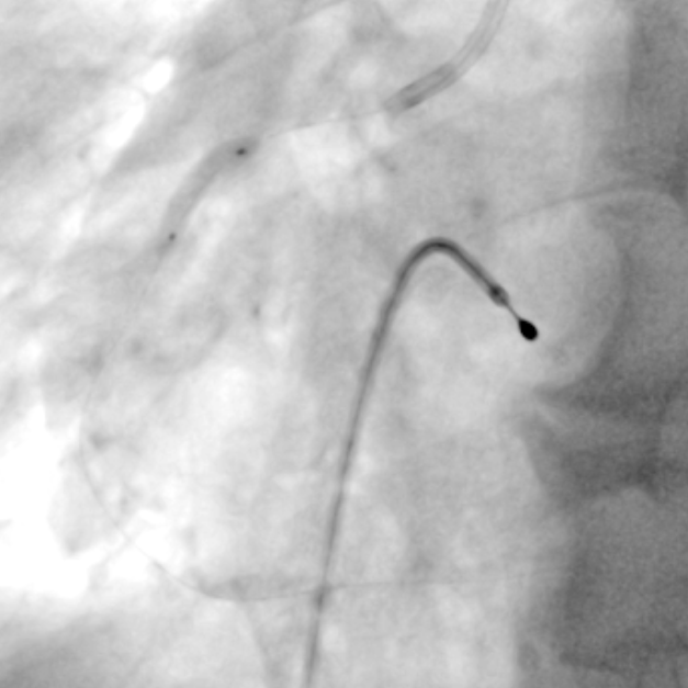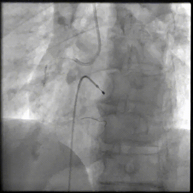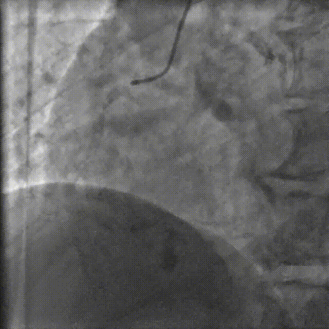 预置临时起搏器后,7F AL1.0无法到位,更换为7F SAL1.0至RCA开口,应用非顺应性球囊2.5X15mm,于RCA中段病变处以12-18atm扩张,球囊膨胀不佳。
