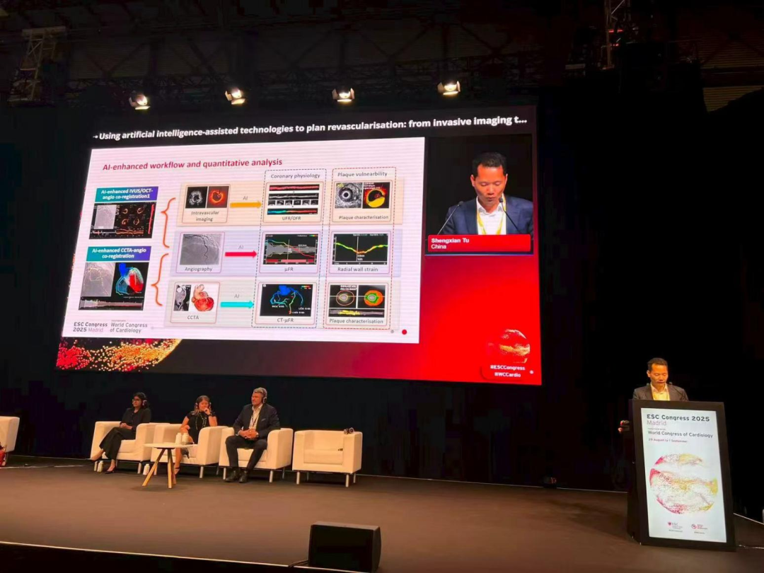 当地时间8月29日,上海交通大学涂圣贤教授受邀在大会进行“AI在冠脉血运重建策略及手术优化全流程应用中最新的研究进展与发展趋势”的报告,介绍了团队在应用AI工具,将冠脉CTA、冠脉造影、腔内影像等技术融合的成果,展现出当前我国科研团队在这一领域的创新实力。