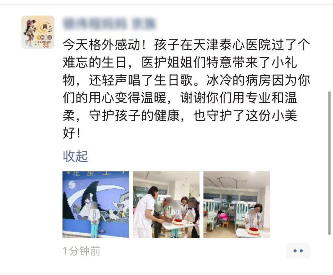 生日当天,病房里响起生日歌。穿着京族服装的成成,在医护人员的陪伴下吹灭蜡烛,小脸上露出腼腆的笑容。“没想到在医院能过这样的生日,”成成妈难掩激动,“这次来天津,不仅让孩子接受了先心病根治手术,更让我们全家感受到了医护人员送来的温暖。”