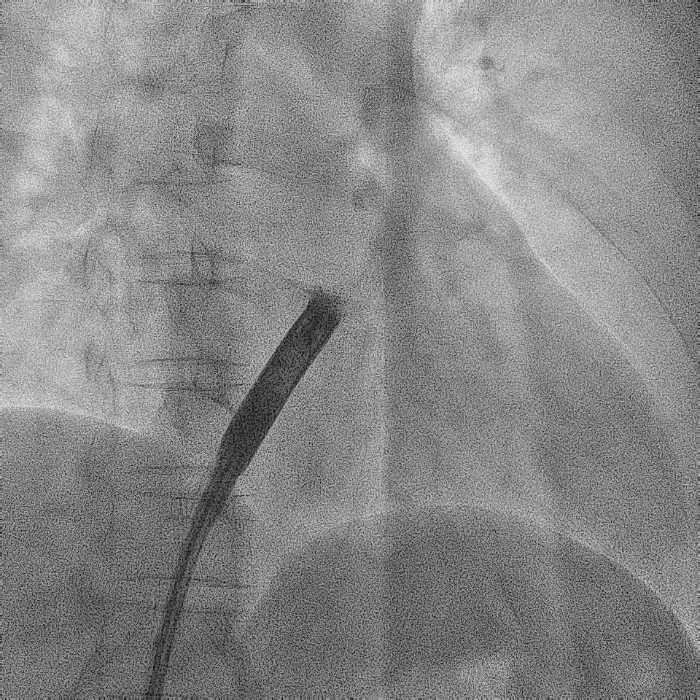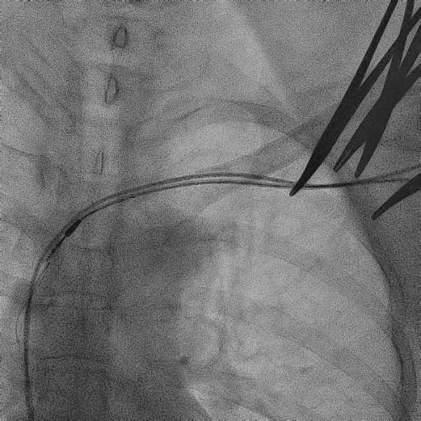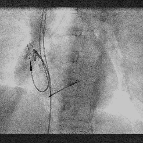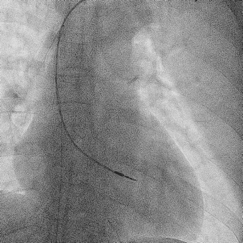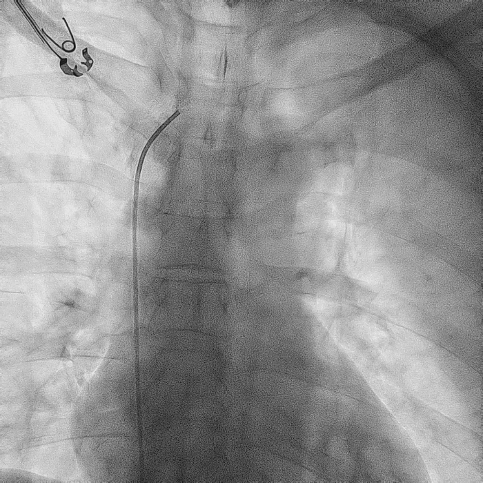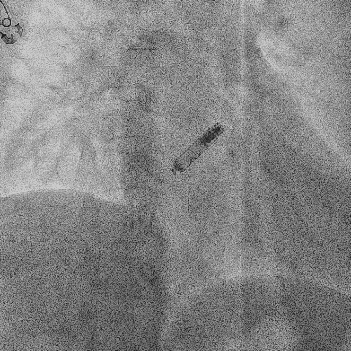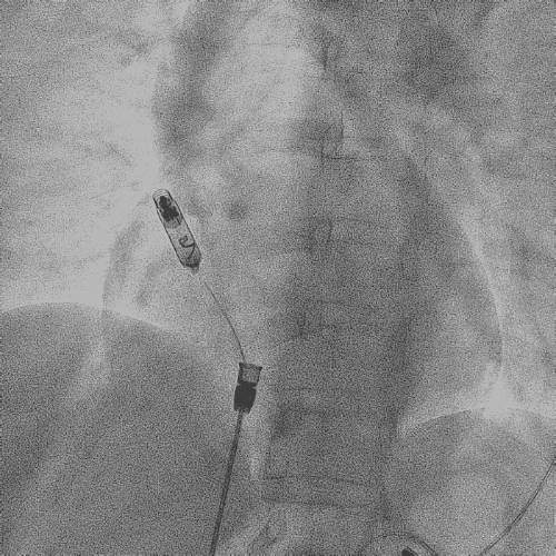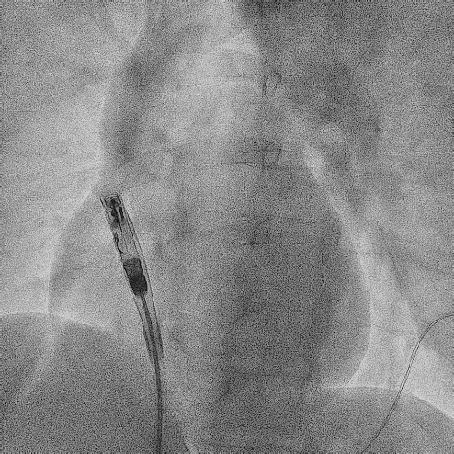 拔除前进行猪尾造影,提前确认原右房导线位置为右心耳中部,心耳空间较大,解剖位置正常。为后续AVEIR™ AR植入做好计划,确认有足够空间避开原起搏导线所在位置。