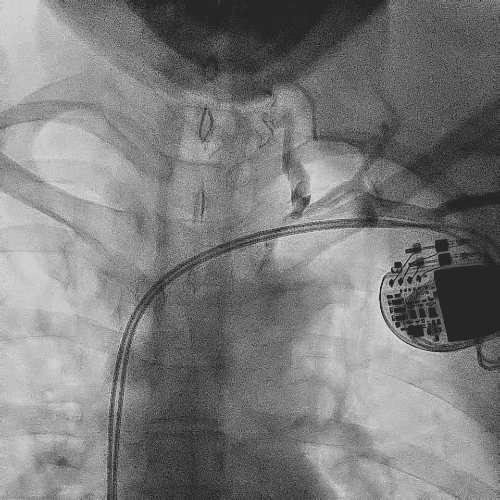 入院后行心脏超声和体表心电图等基础检查,通过检查原起搏器起搏比例确认房室传导正常,体表心电图提示工作模式始终为”AAI”。当将患者之前植入的起搏器程控为VVI起搏模式,发现患者对单心室起搏不耐受,有起搏器综合征症状。且患者本身没有其他入路可以选择,如从对侧植入还会有更严重的上腔静脉阻塞问题。结合患者个人植入无导线起搏器意愿,经李学斌教授团队全面考虑后,给患者确定手术对策——①从锁骨下静脉拔除整套起搏系统。②右侧股静脉做入路,利用外周球囊扩张上腔静脉。③同台植入AVEIR™ AR心房无导线心脏起搏器,为患者提供相应治疗。